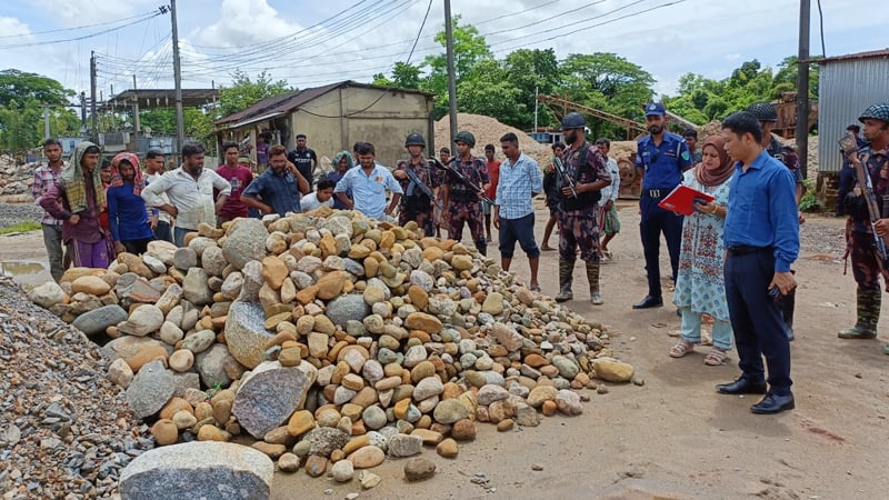 সিলেটের জৈন্তাপুর উপজেলা প্রশাসন ও টাস্কফোর্সের অভিযানে ১৪ হাজার ঘনফুট পাথর জব্দ করা হয়েছে। শনিবার (২৩ আগস্ট) দুপুরে উপজেলার ৪নং বাংলাবাজার এলাকায় অভিযান পরিচালনা করে এসব পাথর জব্দ করা হয়। এর আগে শনিবার সকালে উপজেলার বিভিন্ন এলাকায় অভিযান চালায় টাস্কফোর্স। অভিযান চলাকালে ৪নং বাংলাবাজার এলাকায় কয়েকটি ক্রাশার মিলে রাংপানি নদীর দুই হাজার ঘনফুট ও শ্রীপুর চা বাগানের পাশে মজুত করে রাখা আরও ১২ হাজার ঘনফুট পাথর জব্দ করা হয়।