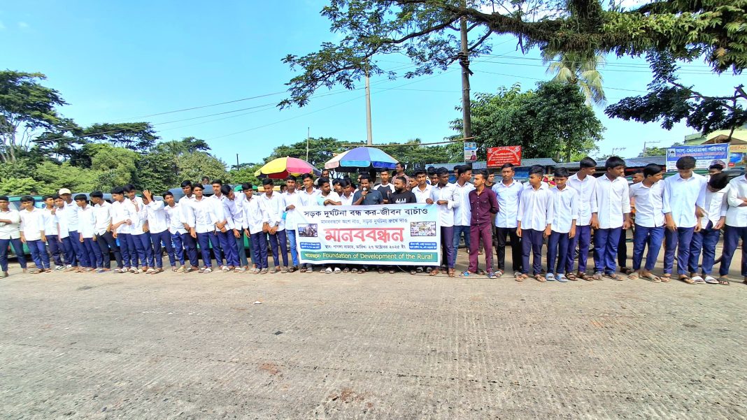 সোমবার (২৭ অক্টোবর) সকাল ১১টায় স্থানীয় সামাজিক সংগঠন “এফডিআর”-এর উদ্যোগে এ মানববন্ধন অনুষ্ঠিত হয়।