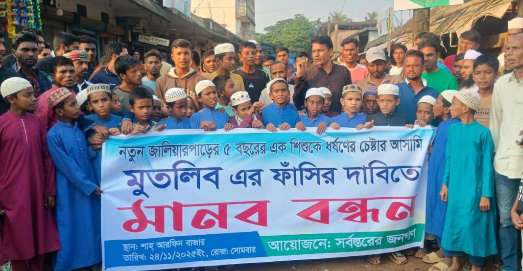 সোমবার (২৪ নভেম্বর) বিকেল সাড়ে ৩টা থেকে সাড়ে ৪টা পর্যন্ত উপজেলার শাহ আরফিন বাজার এলাকায় এ মানববন্ধন করেন। মানববন্ধনে শিশুটির পরিবার, স্থানীয় দোকানদার, শিক্ষক, ছাত্রছাত্রী, সামাজিক সংগঠনের নেতৃবৃন্দসহ কয়েকশ’ মানুষ অংশ নেন। অংশগ্রহণকারীদের হাতে ছিল বিভিন্ন প্ল্যাকার্ড, “শিশু নির্যাতনকারীর ফাঁসি চাই”, “নারী-শিশু নিরাপত্তা নিশ্চিত করো”, “ধর্ষণ চেষ্টাকারীর দৃষ্টান্তমূলক শাস্তি চাই”।